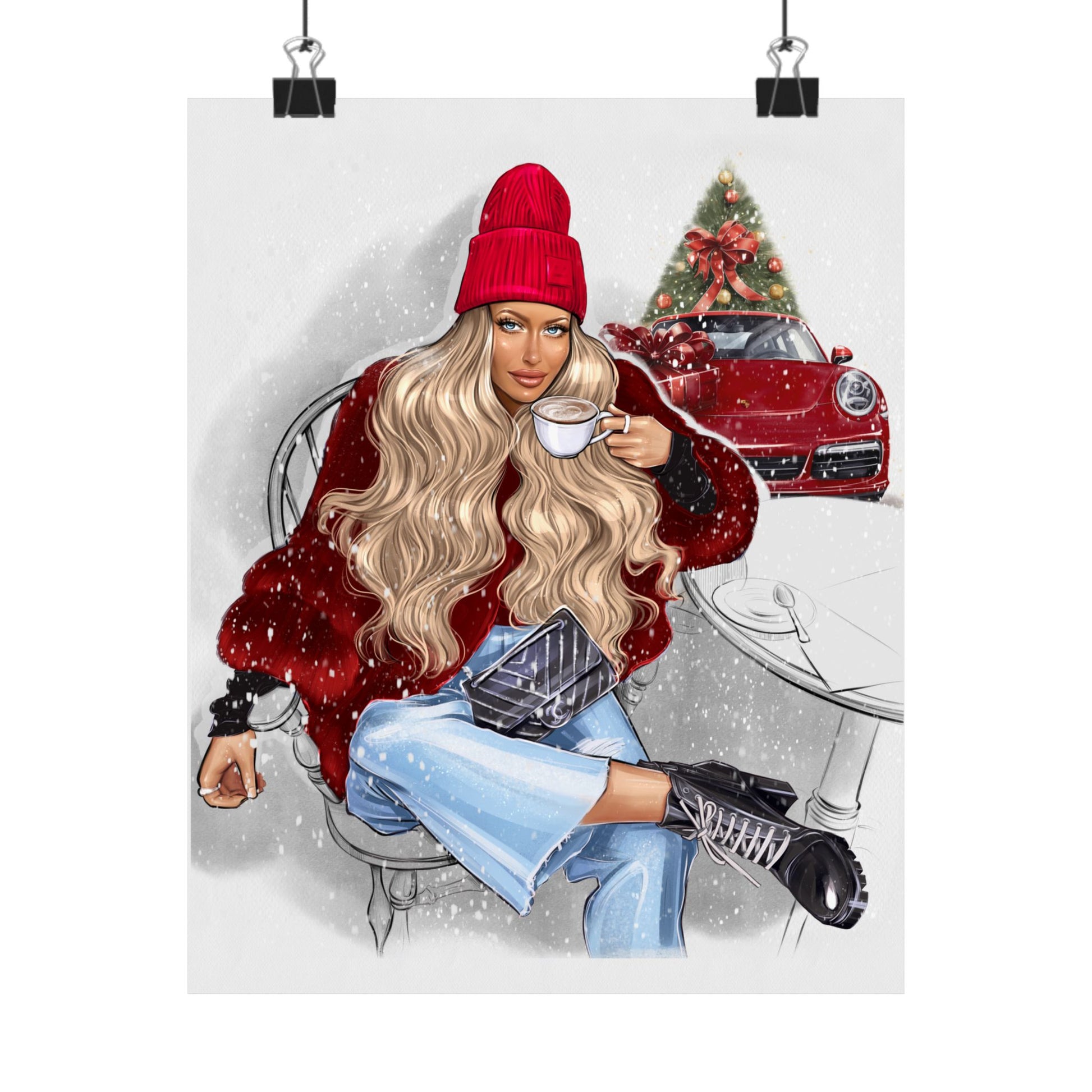 A Christmas themed poster featuring a girl, coffee, and dream car. This poster evokes a cozy and festive vibe, perfect for decorating during the holiday season. Ideal for adults looking to add a touch of holiday cheer to their home or office decor.